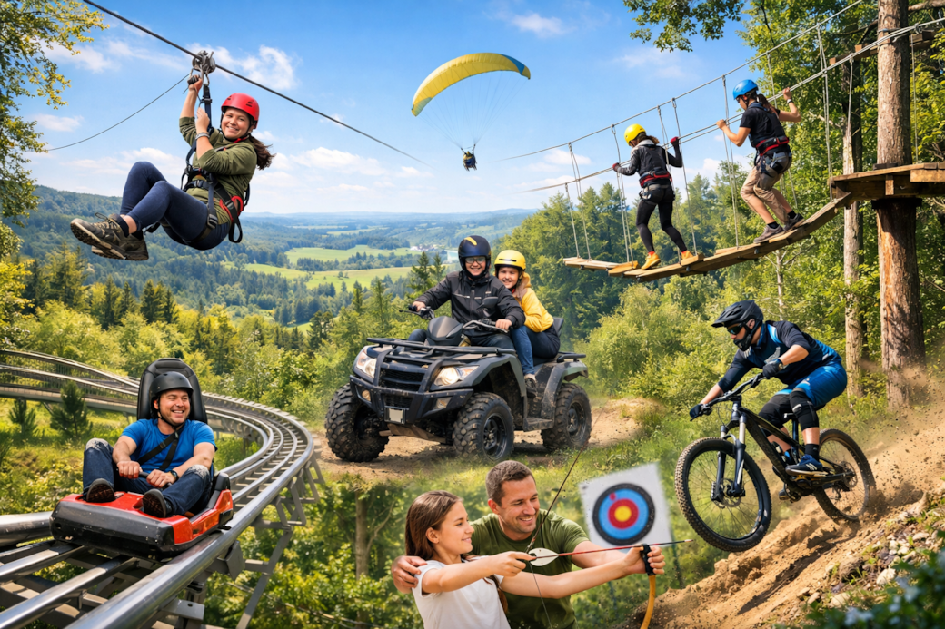 Saussen Sie mit der Sommerrodelbahn ins Tal, erleben Sie den Nervenkitzel einer Zipline hoch über den Baumwipfeln oder entdecken Sie die zahlreichen Wander- und Radwege der Umgebung.